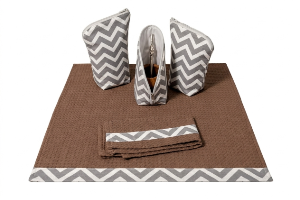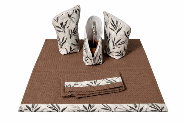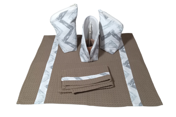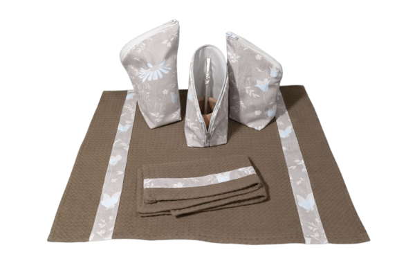 Se completa con repasador y mantel matero en tela panal de abeja, suaves al tacto y de excelente absorción, ideales para el uso diario.